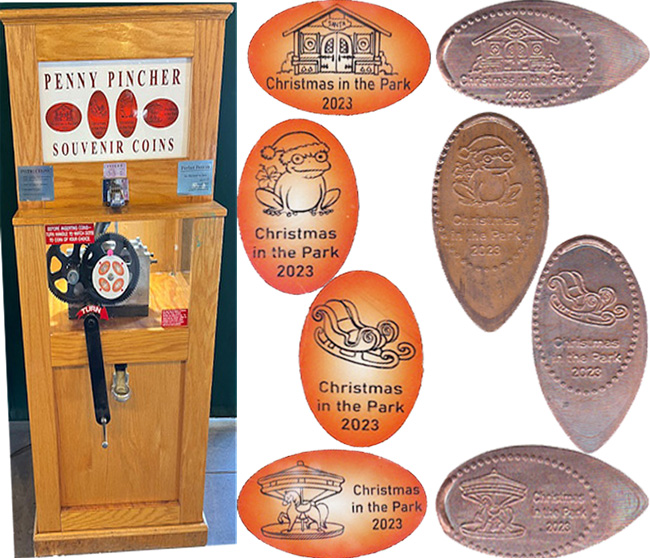 Retired 2023 designs were, All have 'Christmas in the Park 2023' on them: 1) Santa's cabin, 2) Santa's sleigh, 3) Standing frog wearing Santa's hat, 4) Carousel.