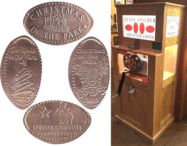 Retired 2015 designs were: 1) 'Christmas in the Park', Steam engine in the middle, 2) 'San Jose, California', California Bear wearing a Santa hat with antlers and a star, 3) 'Christmas in the Park 2015', Stylized Christmas tree 4) 'Christmas in the Park 2015', Rudolph with lights around his antlers