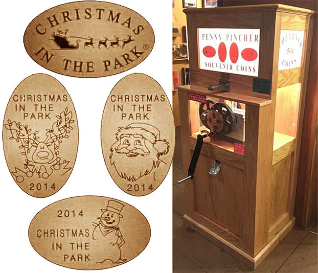 Retired 2014 designs, all said "Christmas in the Park. they were: 1) Santa in his sleigh being pulled by his Reindeer with the celebration name over and under it, 2) Rudolph with lights around his antlers, Dated 2014, 3) Santa's head under the Celebration name, Dated 2014, 4) Frosty the Snowman to the right of the celebration name, Dated 2014