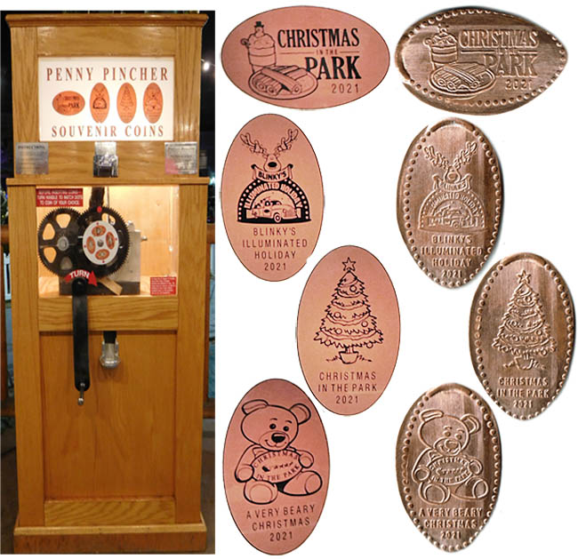 Retired 2021 designs were: 1) 'Blinky's Illuminated Holiday 2021', Reindeer head over holiday logo, 2) 'Christmas in the Park 2021', Snowman over plate of food right of name, 3) 'Christmas in the Park 2021', decorated Christmas Tree, 4) 'A Very Beary Christmas 2021', teddy bear sitting.