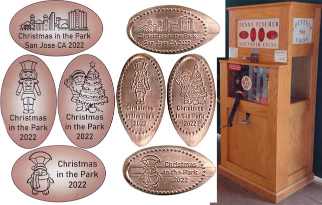 Retired 2022 designs were: 1) 'Christmas in the Park 2022', Skyline of the City of San Jose, 2) 'Christmas in the Park 2022', Santa to the left of a Christmas tree, 3) 'Christmas in the Park 2022', Male nutcracker, 4) 'Christmas in the Park 2022', Penguin floating under a parashoot.
