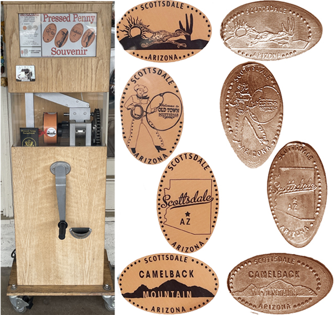 Machine 1 is outside of the store just to the left of the entrance. Cost to press: 51¢ each design. Designs all have 'Scottsdale Arizona' on them: