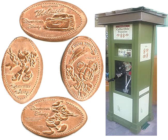 The machine is located outdoors near the entrance to Apricot Lane (was in front of the Vinylmation Store) at DownTown Disney Anaheim. This is a 4 design Pennyman hand crank penny machine.