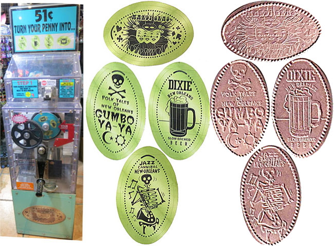 Machine 1 is inside in the back of the store. Cost to press: 51¢ each design. Designs all have a beaded border.