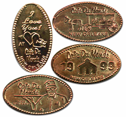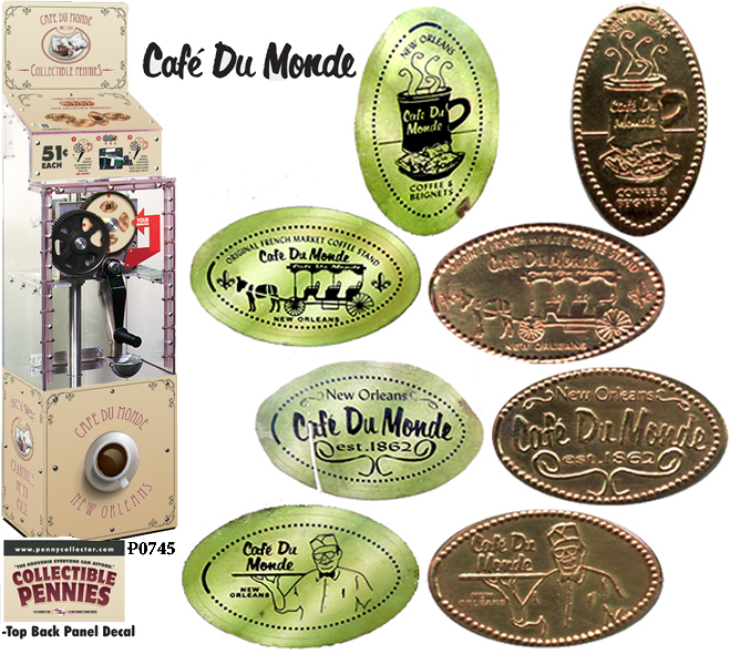 Machine 2: Cost to press: 51¢ each design. Designs all with 'Café Du Monde, New Orleans'. Update: visited on 10/7/2024 and this machine is fixed!