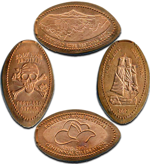 4) '2007 Rose Festival Portland, Oregon', Skull and crossed bones in middle, Rose on upper left & lower right bone