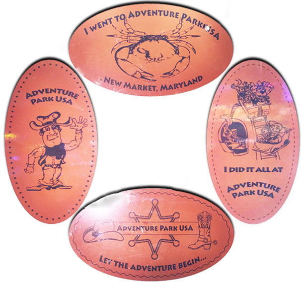 11113 Baldwin Road New Market, MD , 21774 Phone: 301-865-6800 Website The machine is located inside near the back before you go outside to the rides. There is no admission to go in and use the machine. There are four designs. Machine is rolling fine, slightly short on copper cents.
