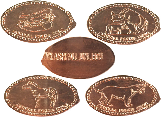 The machine is located in visitor center to the right when entering. The machine contains 4 designs and has the Ashfall website on the back. They have 'Ashfall Fossil Beds' on the front. Each design costs $.76. Designs are;