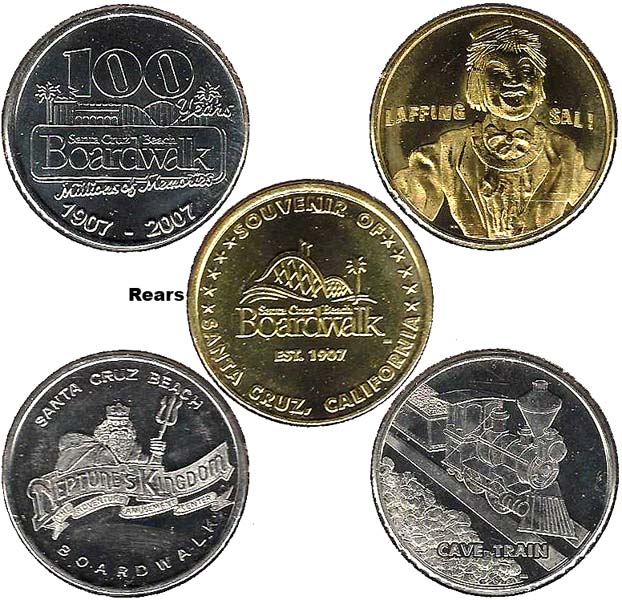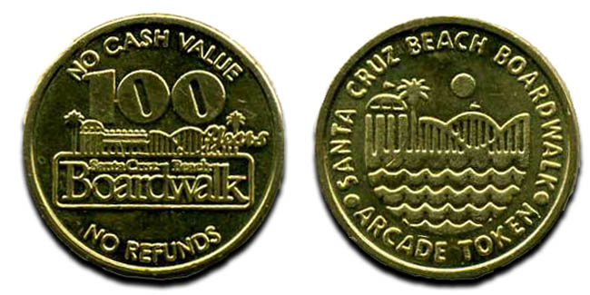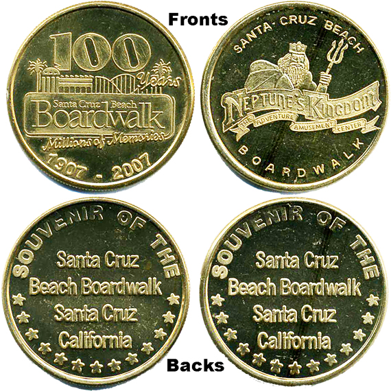 Retired Token 2) Brass color token; Front; '100th Years, Santa Cruz Beach Boardwalk, Millions of Memories 1997 - 2007' 100 over boardwalk area over name over saying over dates. Rear; 'Souvenir of the Santa Cruz Beach Boardwalk Santa Cruz California' with star border