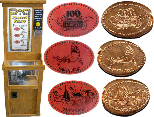Retired 1: 1) One-sided penny with 100-year Anniversary of Beach Boardwalk (1907-2007) (H), 2) Shark turning from going right to going forward, "Santa Cruz" on the bottom in the Dot Borde/ (H), 3) Ocean scene showing the sun setting into the Ocean, birds flying over and a sandy beach under. Palm Trees on either side of the beach. "Santa Cruz" under in dots/ (H)