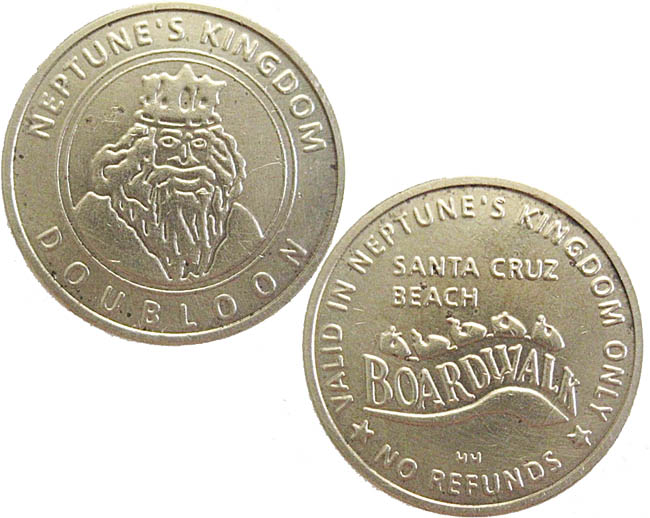 Retired Token 3) Brass color token Front; Neptune's Kingdom, the Adventure Amusement Center, Santa Cruz Beach Boardwalk', image of Neptune over banners with its name, Boardwalk name around top and bottom, Rear; 'Souvenir of the Santa Cruz Beach Boardwalk Santa Cruz California' with star border
