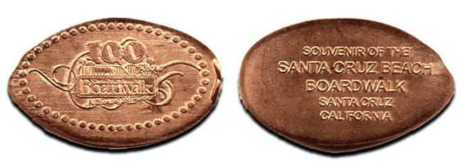 Moved 2) (moved to the Boardwalk Casino Arcade). 2-sided penny with '100-year Anniversary of Beach Boardwalk (1907-2007)' on front and "Souvenir of Santa Cruz Beach Boardwalk Santa Cruz, California' on back/ (H)