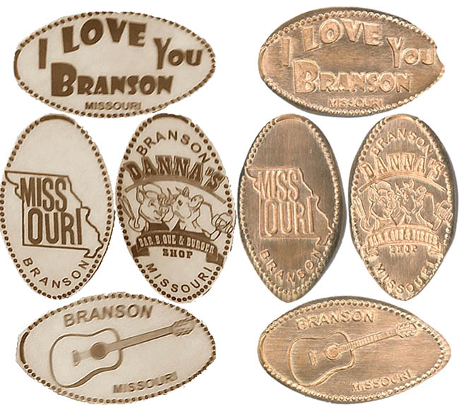 2) 'Branson, Missouri' State name in state outline, City below,