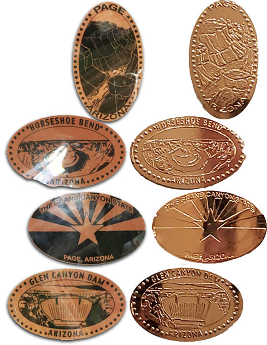 1. (V) Colorado River in a canyon with 'Page Arizona', 2. (H) Horse Shoe Bend with 'Horse Shoe Bend', 3. (H) Arizona State flag with 'The Grand Canyon State Page, Arizona', 4. (H) Glen Canyon dam with 'Glen Canyon Dam Arizona'.