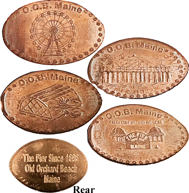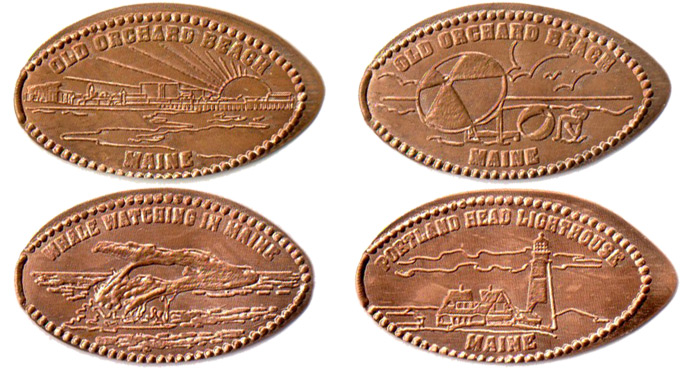 Machine 3 The machine is on your right next to claw machines when entering the pier. It has 4 images all say 'Old Orchard Beach Maine' on them. Each design costs 3 quarters and 1 penny. Designs are: