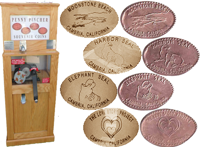 Machine 1 is outside in front of the side door during business hours. Cost to press: 51¢ each design. Designs all have a beaded border with 'Cambria, California':