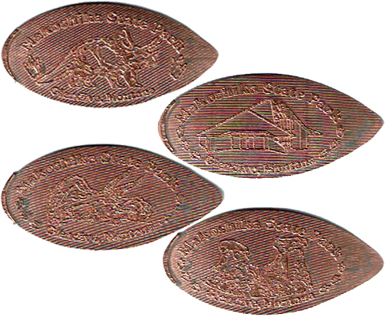 Machine 1 is in the Park's Store on the main level. Cost to press: 51ยข each design. Designs all have a beaded border with 'Makoshika State Park Glendive, Montana':