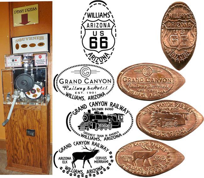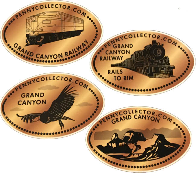 Retired 2: All had 'Williams, Arizona' on them. 1) 'Arizona Route 66', sign, 2) 'Grand Canyon Railway & Hotel', Logo, 3 'Grand Canyon Railway, Baldwin #4960, Greatest Train in America', image of engine. 4) 'Grand Canyon Railway, Arizona Elk Cervus Merriami', Elk