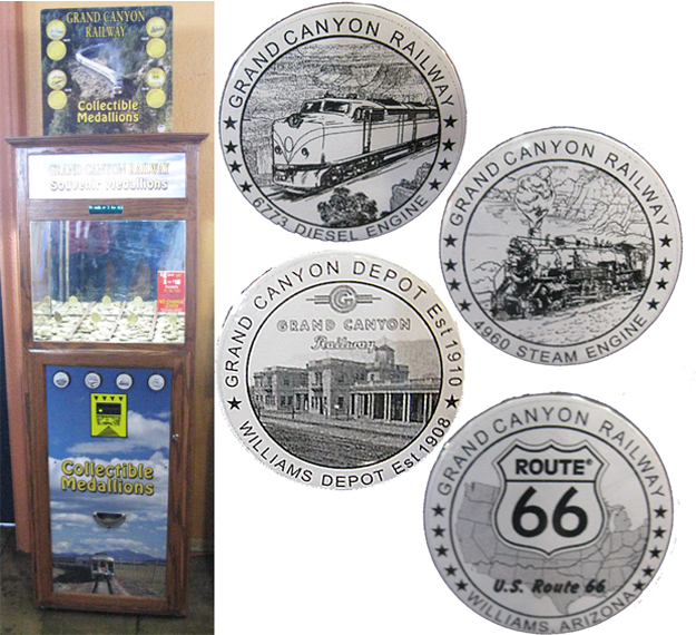 The tokens are 1.5-inch-diameter, gold-colored coins/medallions with an image on the obverse and corresponding text on the reverse. They cost 3 for $10 or $4 each (machine does not give change). I found a "Grand Canyon National Park Medallion Collector Book" for these tokens at the Desert View Trading Post inside the Grand Canyon National Park.