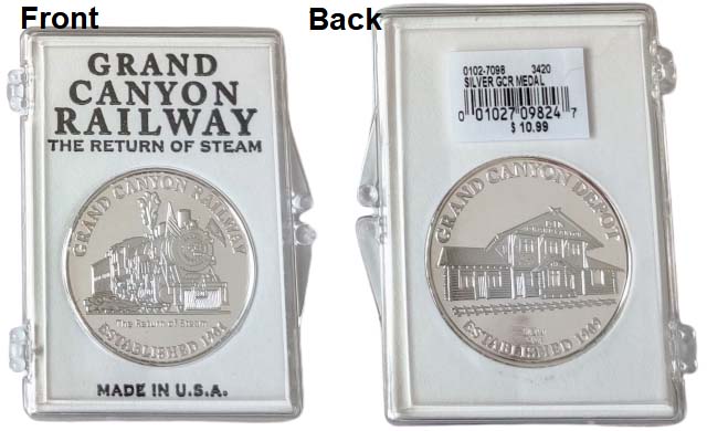 1) Front of case- 'Grand Canyon Railway, Return of the Steam/ Front of token- Grand Canyon Railway Established 1901, The Return of Steam', Steam engine