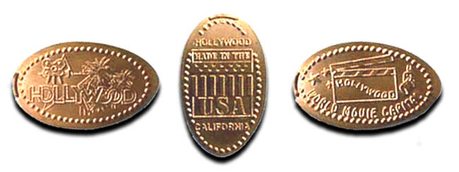 Retired 1: 1) (H) Hollywood sign with movie camera on left and palm trees on right, 2) (V) 'Hollywood California' with 'Made in the USA' on a stylized flag, 3) (H) A clapboard, three stars and a microphone with 'Hollywood World Movie Capital'.