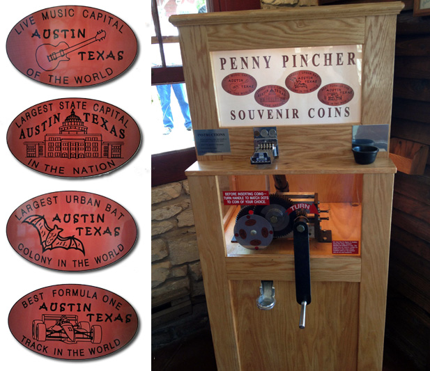 1003 Barton Springs Road Austin, TX , 78704 Phone: 512-394-5899 Website 4/22/17: This penny machine is gone. Asked hostess, & she said the restaurant was tired of it breaking and sent it back.