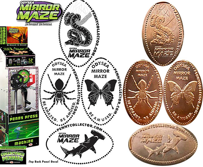 Machine 1 (Placed 11/15) is outside the entrance to the Mirror Maze. Cost to press: 51¢ each design. Designs all have a pennycollector.com beaded border with 'Odysea Mirror Maze':