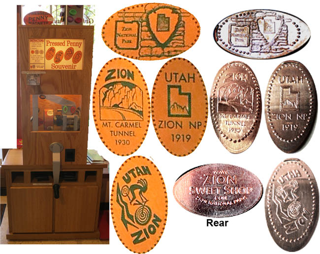 Machine 1 is inside the door to the left. Cost to press: 51¢ each design. Designs all have a beaded border with 'Zion':