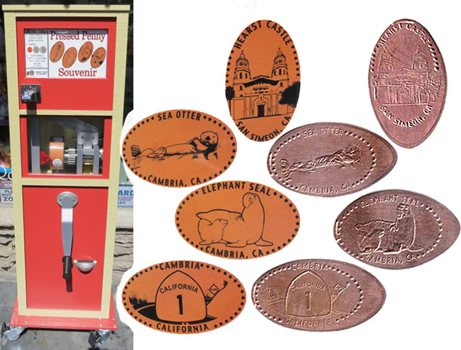 Machine 1 is outside the front entrance of the market to the right. Cost to press: 51¢ each design. Designs all have a beaded border: