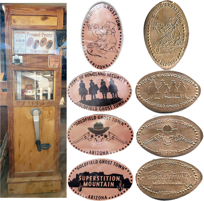 Machine 1 (Placed 4/16) is inside the Prospector's Palace to the left. Cost to press: 51¢ each design. Designs all have 'Goldfield Ghost Town' on them: