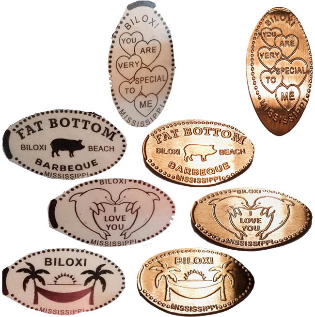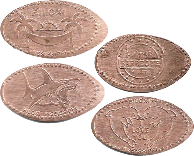 Retired 2: 1) 'The Fat Bottom Barbeque, Biloxi Beach', logo, 2) 'Biloxi', with palm trees, a hammock and setting sun, 3) 'I Love You', two Dolphins on tails kissing, 4) 'You are Very Special to Me, Biloxi, Saying words in hearts.