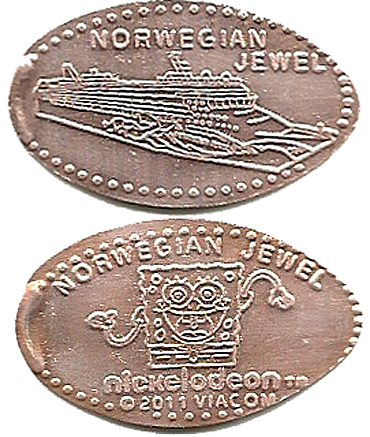 Retired 1: Zinc pennies are supplied by the machine. 1) 'Norwegian Jewel', ship, 2) 'Norwegian Jewel, Nickelodeon', SpongeBob, 3) ????, 4) ????