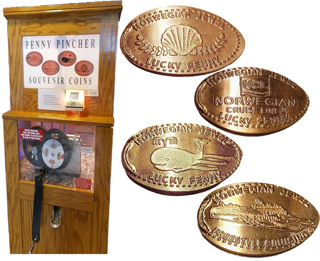 Machine 2, located on Deck 7 starboard in a corridor between the Bliss Lounge and the Crystal Atrium. Each penny costs $1.10 to roll, and ship passengers must swipe their cabin keycard to work the machine. The pennies are supplied by the machine, All designs include the words 'Norwegian Jewel'.