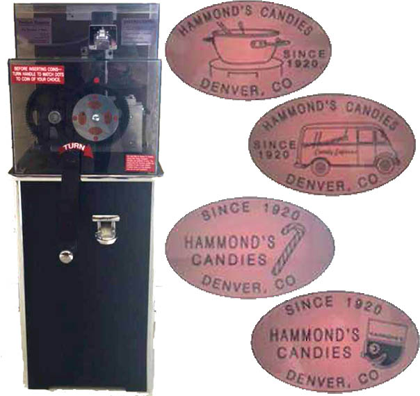 The machine is in the Tour Center, which is the right-most door when facing the building. It is located immediately left of the door after you enter the building. All have 'Hammond's Candies Denver, CO Since 1920'. Designs are: