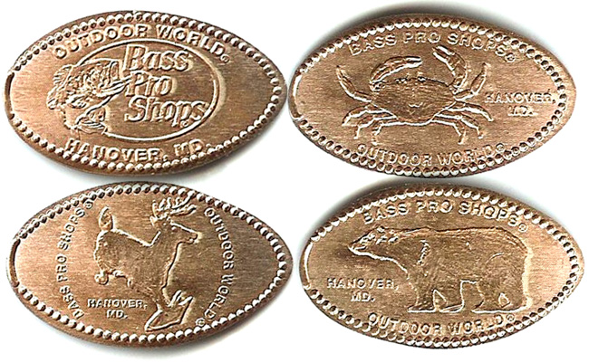 The machine is by the fish tank. All have 'Bass Pro Shops Outdoor World Hanover, MD' on them. Designs are: