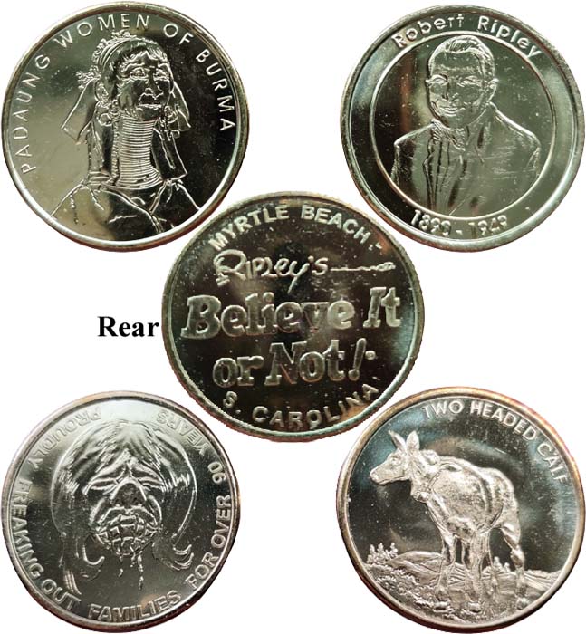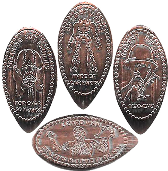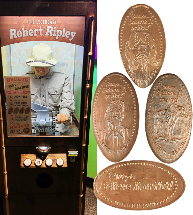 Machine 2: All have 'Ripley Believe it or Not!' and 'Myrtle Beach' on them. Machine is located by the exit, which leads into the arcade. The push button machine costs $1 per penny with pre-loaded pennies. Designs are: