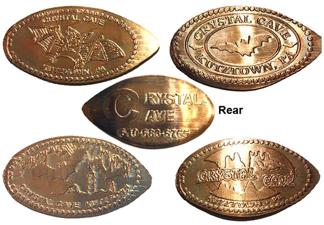 The machine is inside the souvenir shop by the door. All have 'Crystal Cave Kutztown' on the fronts and 'Crystal Cave 610 688 6765' on the backs. Designs are: