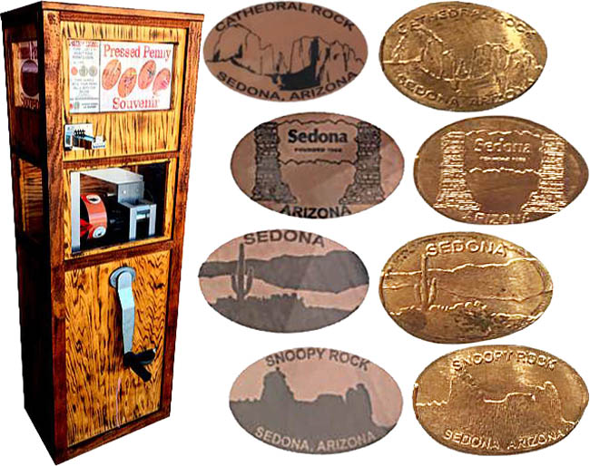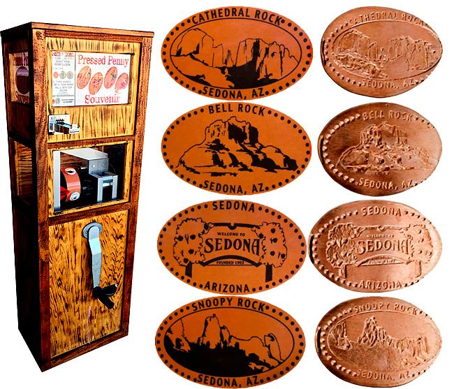 Machine 1 is outside in the front of the souvenir store. Cost to press: 51¢ each design. Designs all have a beaded border with 'Sedona':