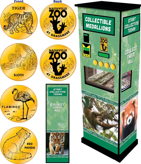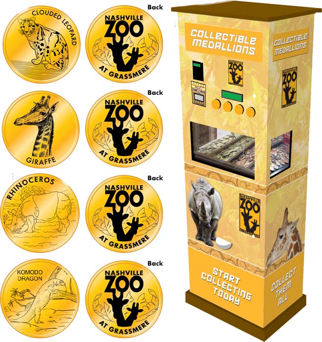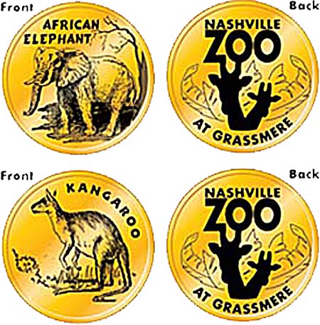 Retired tokens from Token Machine 1: 1) Giraffe, 4) Kangaroo