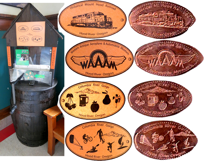Machine 1 is inside the gift shop to the right of the entrance. Cost to press: 51¢ each design. Designs all have a beaded border with 'Hood River Oregon':