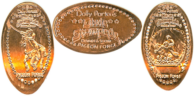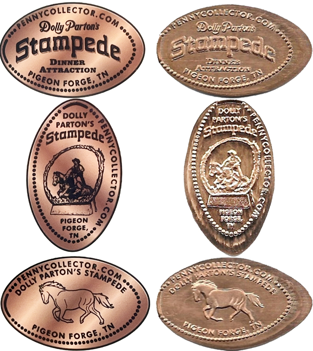 Retired 3: All have 'Dolly Parton's Dixie Stampede' on them: 1) Galloping Horse, 2) Word logo, 3) Man on horse.
