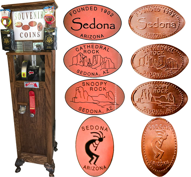 Machine 1 is inside. Cost to press: 51¢ each design. Designs all have a beaded border with 'Sedona':