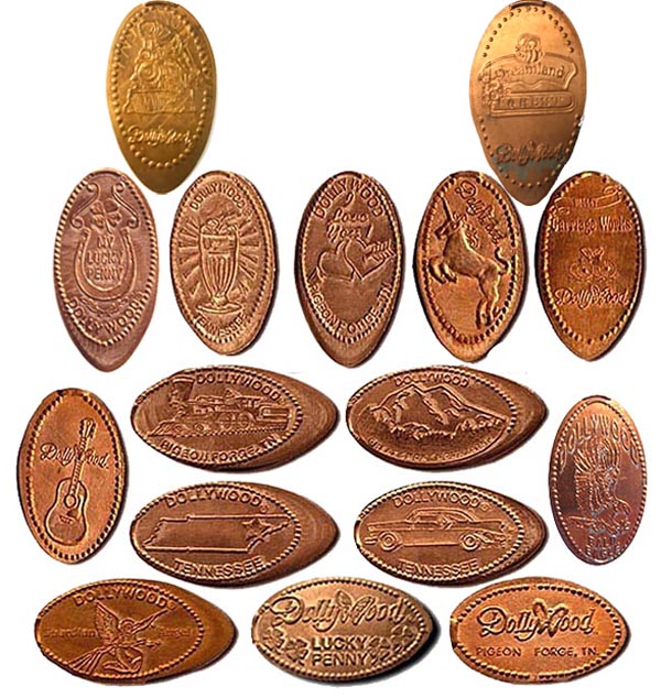 Retired Others 1: 1) My Lucky Penny Dollywood, 2) Dollywood Tennessee (Ice Cream Cone), 3) I Love You, Dollywood Pigeon Forge, TN, 4) Dollywood (Unicorn), 5) Carriage Works Dollywood, 6) Dollywood (Guitar), 7) Dollywood Pigeon Forge TN (Steam Train), 8) Great Smoky Mountains Dollywood, 9) Dollywood Tennessee (Old car), 10) Bald Eagle Dollywood, 11) Guardian Angel Dollywood, 12) Dollywood Lucky Penny, 13) Dollywood Pigeon Forge, TN (Word Logo), 14) Dollywood Tennessee (Image of State), 15) Dreamland Forest, 16) Train - Dollywood
