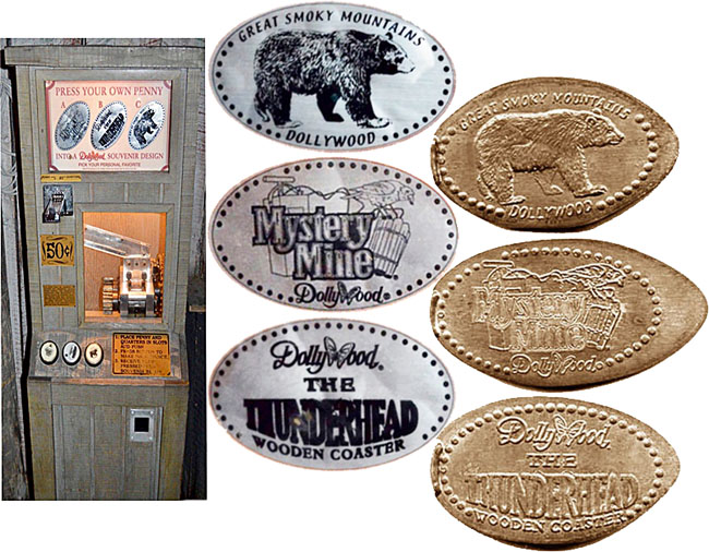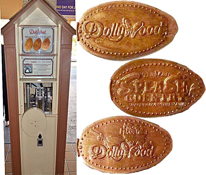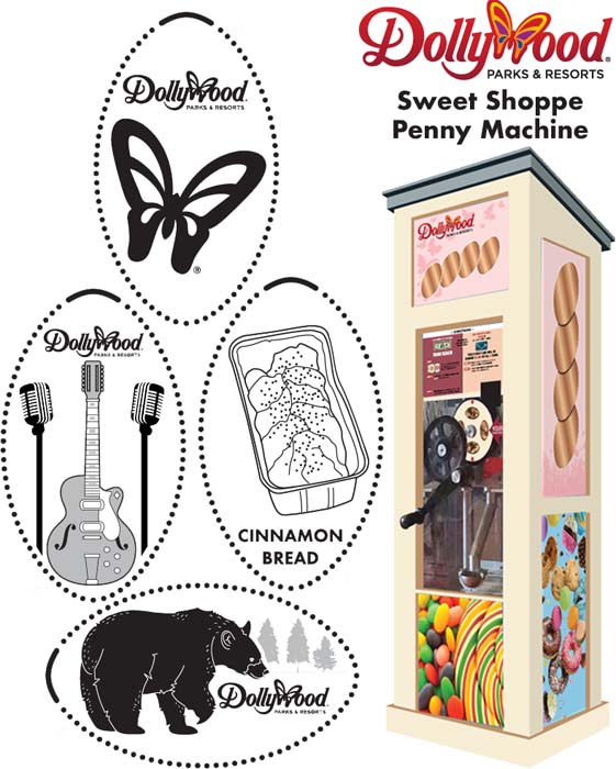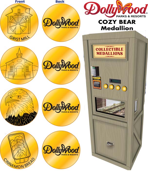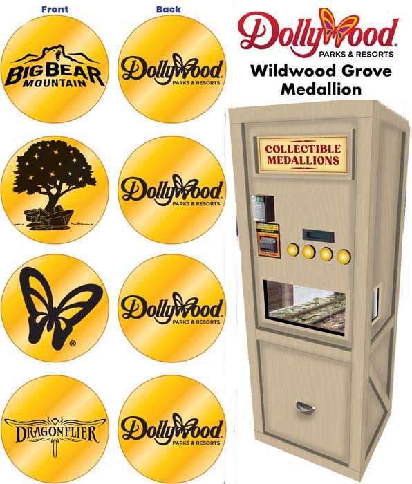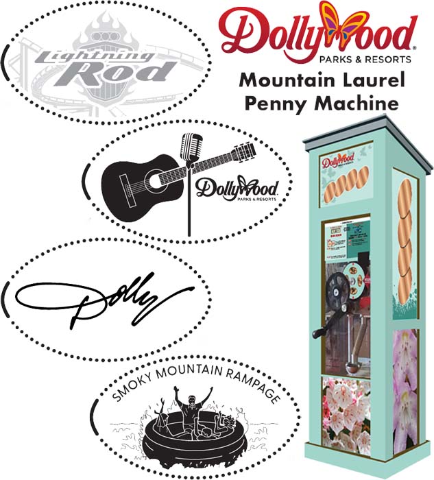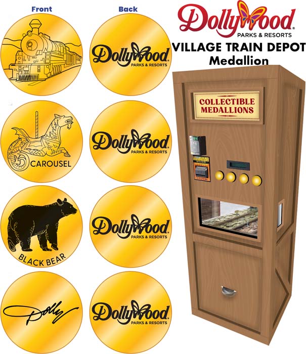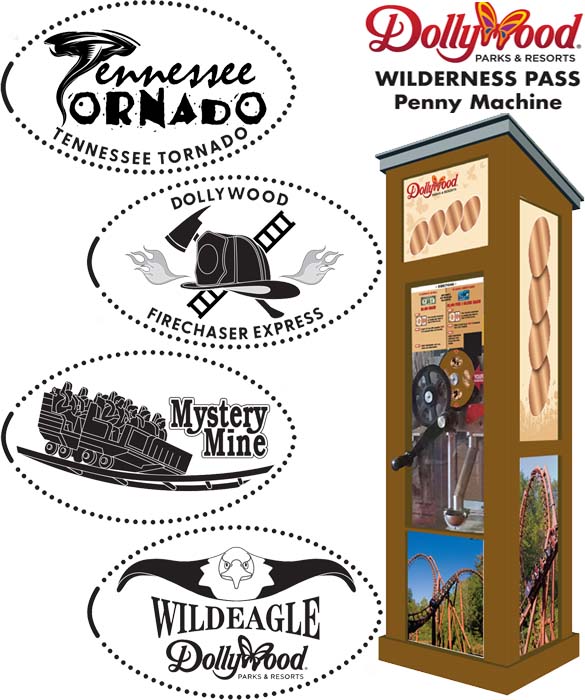 Retired Token Machine 1: 1) Lightning Rod rollercoaster logo, 2) Dolly Parton portrait Est 1986, 3) Wild Eagle Logo 2012, 4) Dolly Parton portrait Est 1986.