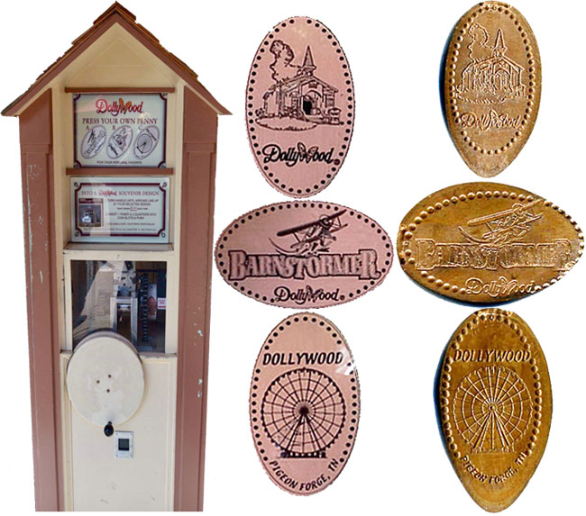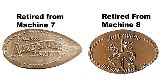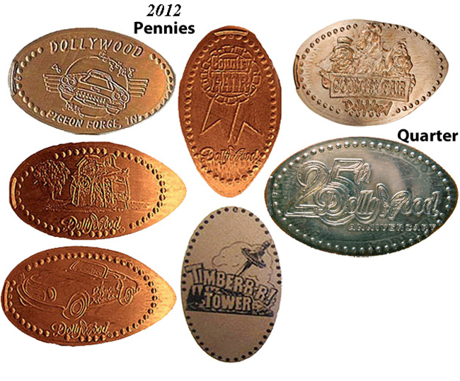 Retired Others 2: (2012 designs) 1) Dollywood (Building and tree), 2) Country Fair Dollywood (Award Ribbon), 3) Country Fair Dollywood (Animals above sign), 4) Dollywood Pigeon Forge, TN (Old Corvette), 5) Dollywood (Old Car), 6) Terror Tower, 7) Dollywood 25th Anniversary (Quarters, 8) Dollywood 2007 (Quarters).