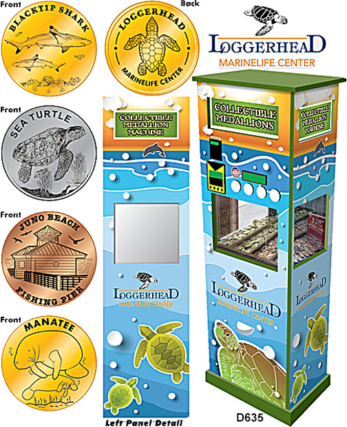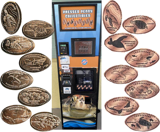 Machine 2 (Placed 7/21/2022) is inside the gift shop right by the medallion machine. Cost to press: pre-loaded with Zinc pennies for $1 for one design ($1.00 dollar bill only) $5 for all 8; no change given. Credit card for $5 charge for all 8 designs only. Designs all have a pennycollector.com beaded border with 'Loggerhead Marinelife Center':