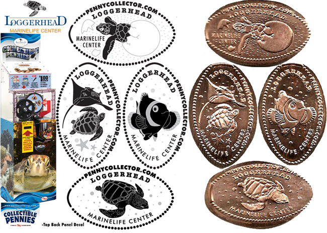 Machine 1 (Originally placed 4/2018, returned 07/21/2022) is outside by the turtle tanks against the wall. Cost to press: $1.00 each design (dollar bills only; no quarters or credit cards accepted). No pennies required. This is a new type PennyCollector machine that accepts a $1.00 bill for each design and after hand cranking, presses a pre-loaded zinc penny. Designs all have a pennycollector.com beaded border with 'Loggerhead Marinelife Center':