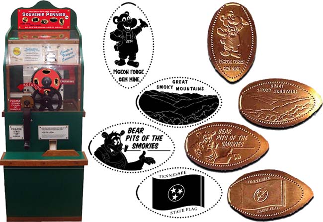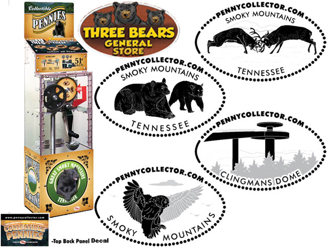 Retired 1: 1) 'Pigeon Forge Gem Mine', Bear, 2) 'Bear Pits of the Smokies', Bear , 3) 'Great Smoky Mountains', 4) 'Tennessee State Flag'.