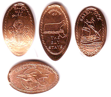 Retired 1: 1) (V) Skeleton torso medicine man, "Salem Wax Museum", 2) (V) Massachusetts outline, "Souvenir of The Bay State", 3) (V) Pirate ship, "Salem Wax Museum", 4) (H) Witch on a broom with a full moon, flying left "Salem Wax Museum"