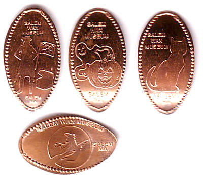 Retired 2: Designs all say "Salem Wax Museum, Salem MA" 1) (V) Cat outline, 2) (V) Ghost and jack-o-lantern, 3) (V) Pirate, flag, treasure chest, 4) (H) Witch on a broom in front of a full moon, flying right